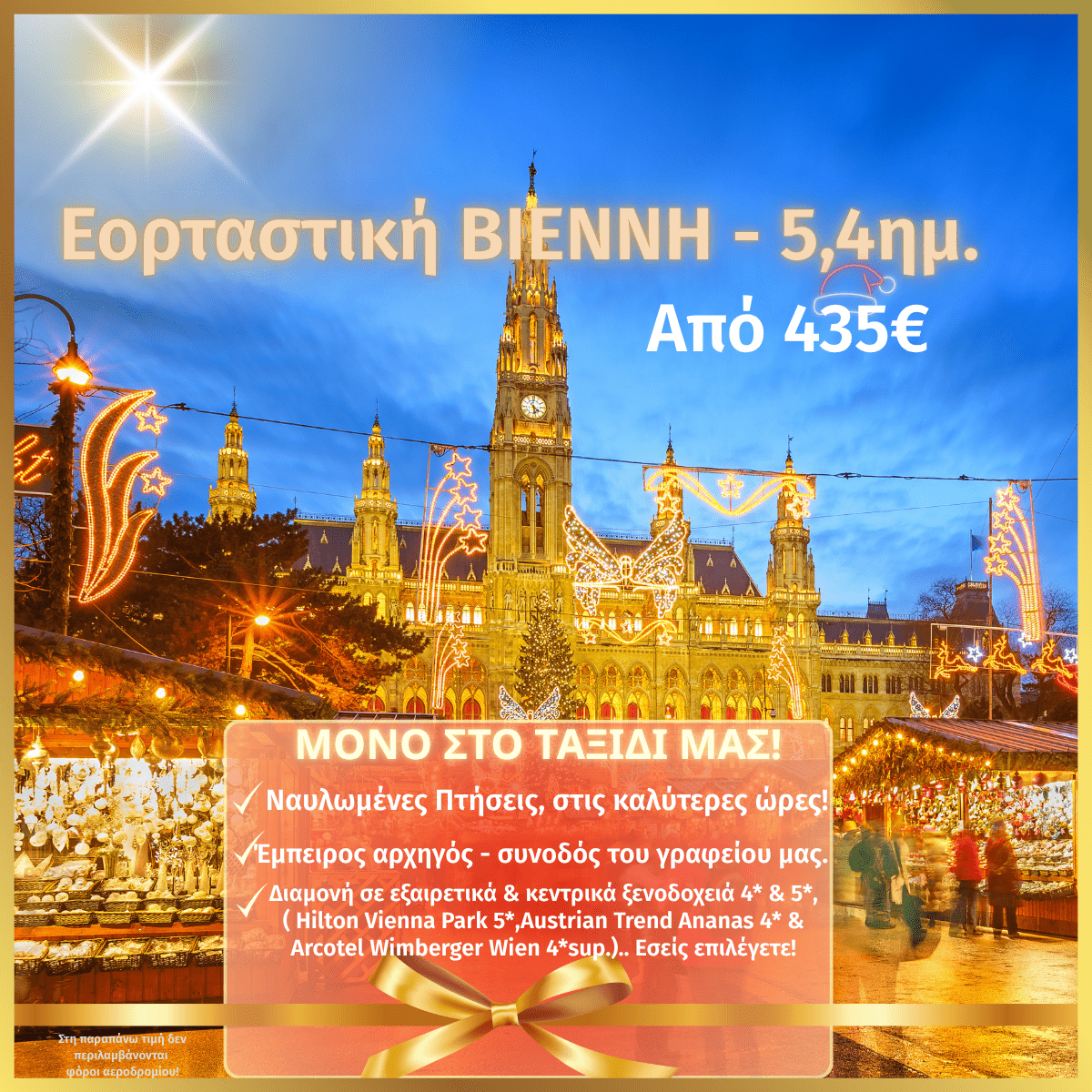 Χριστούγεννα & Πρωτοχρονιά, στο απόλυτο εορταστικό πρόγραμμα για να απολαύσετε τη πρωτεύουσα του βαλς, την εκθαμβωτική Βιέννη! Γνωρίστε μέσα από την πανοραμική μας ξενάγηση τη πόλη του Φρόιντ και του Κλίμτ, με τα μεγαλοπρεπή παλάτια και μνημεία, εκεί που η αίγλη του αυτοκρατορικού συνυπάρχει αρμονικά με τα avant-garde στολίδια της! Με ΔΩΡΟ 2 εκδρομές, στο εκθαμβωτικό Σάλτσμπουργκ του Μότσαρτ και περιήγηση στα δάση Μάγερλινγκ, με την σπουδαία αρχιτεκτονική και τέχνη, που αποπνέει πάντα ζωντάνια και χαρά! Ο αστραφτερός κόσμος της Βιέννης που αποτελεί την πρωτεύουσα των Χριστουγέννων στην Ευρώπη, θα σας χαρίσει αξέχαστες στιγμές! ME ΔΙΑΜΟΝΗ ΣΕ 4* & 5* ΞΕΝΟΔΟΧΕΙΑ! Πετάμε με ναυλωμένες πτήσεις στις καλύτερες ώρες για ένα γεμάτο 4ήμερο & 5ήμερο ταξίδι!